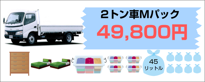 〜1DKの不用品回収なら2tトラック車積み放題パック!軽トラでは乗り切らない分も2t車なら楽々搭載可能。