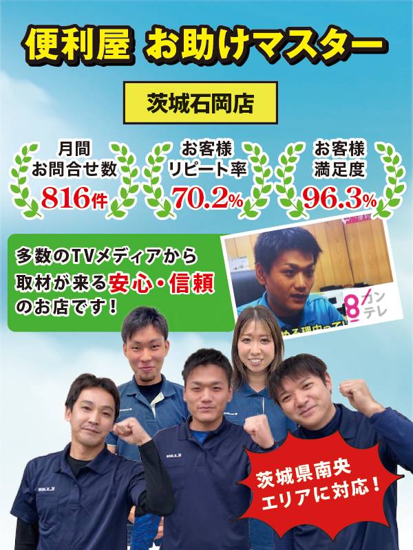 この度は便利屋お助けマスター茨城石岡店にご来店いただきまして誠にありがとうございます。当社では「格安」を売りにしているわけでは無く、決して大手の便利屋さんでもありません。しかし、そんな中当社をお選びいただけたお客様には必ず「選んでよかった」 と言っていただけるサービスのご提供をお約束いたします。